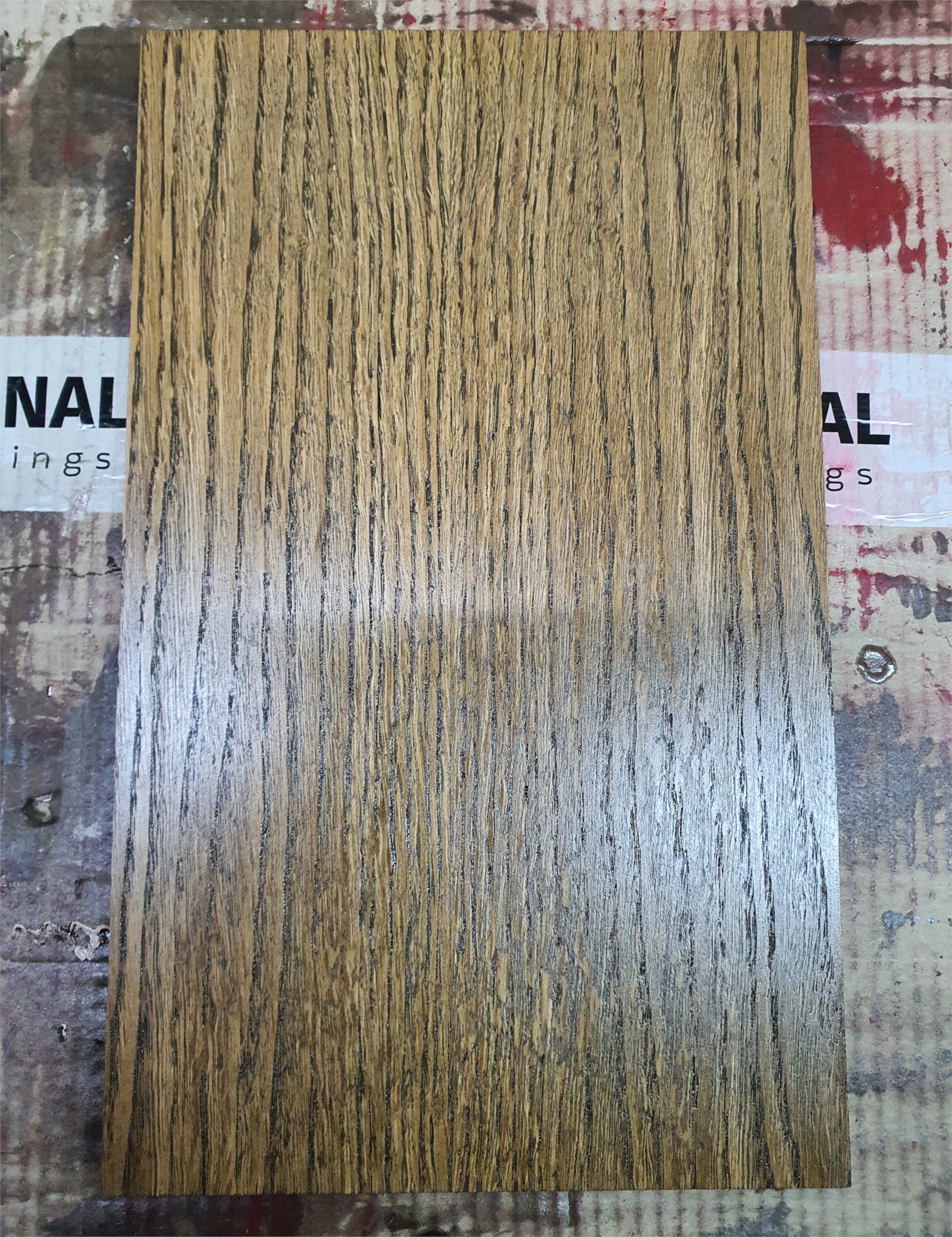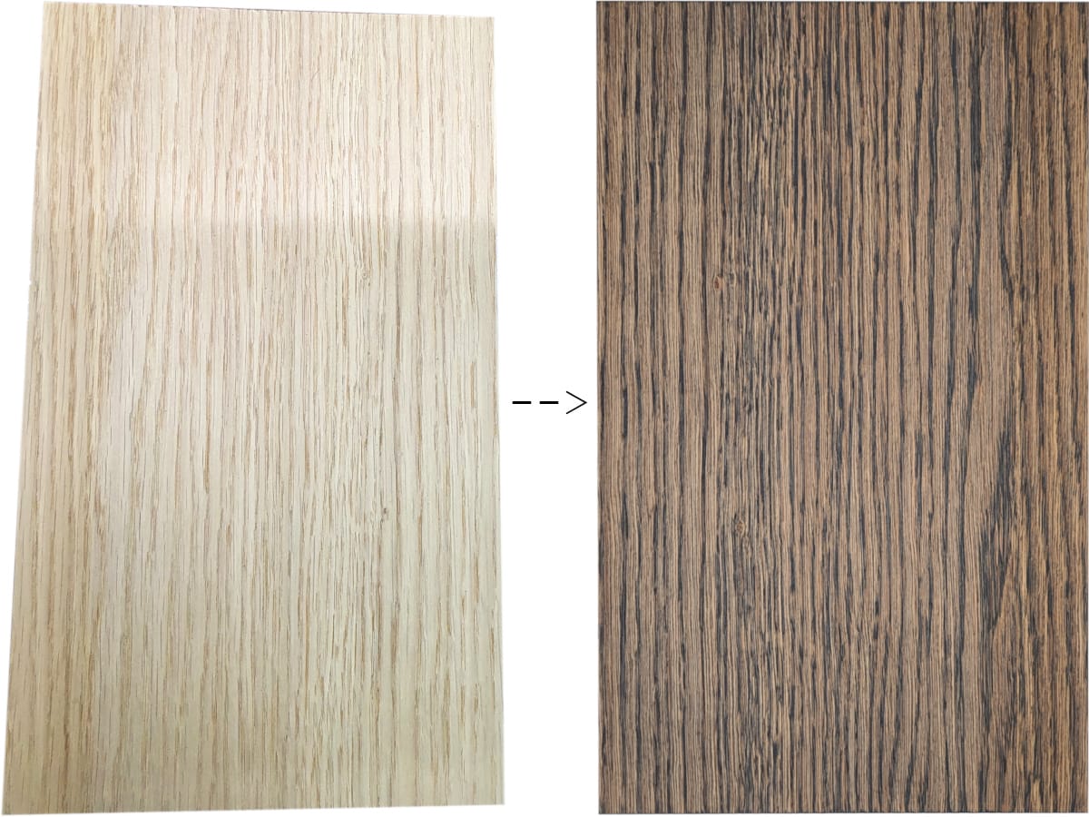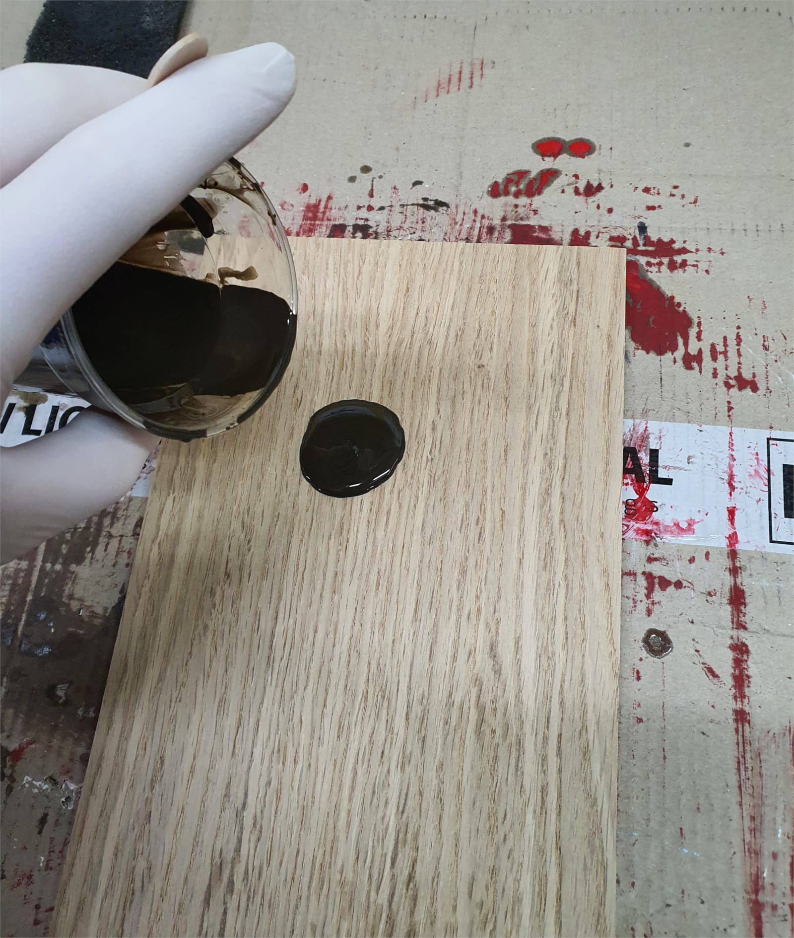 Tak wygląda próbka świeżo po nałożeniu pierwszej warstwy oleju GE 11254 Hesse Lignal w odcieniu Castle Brown.