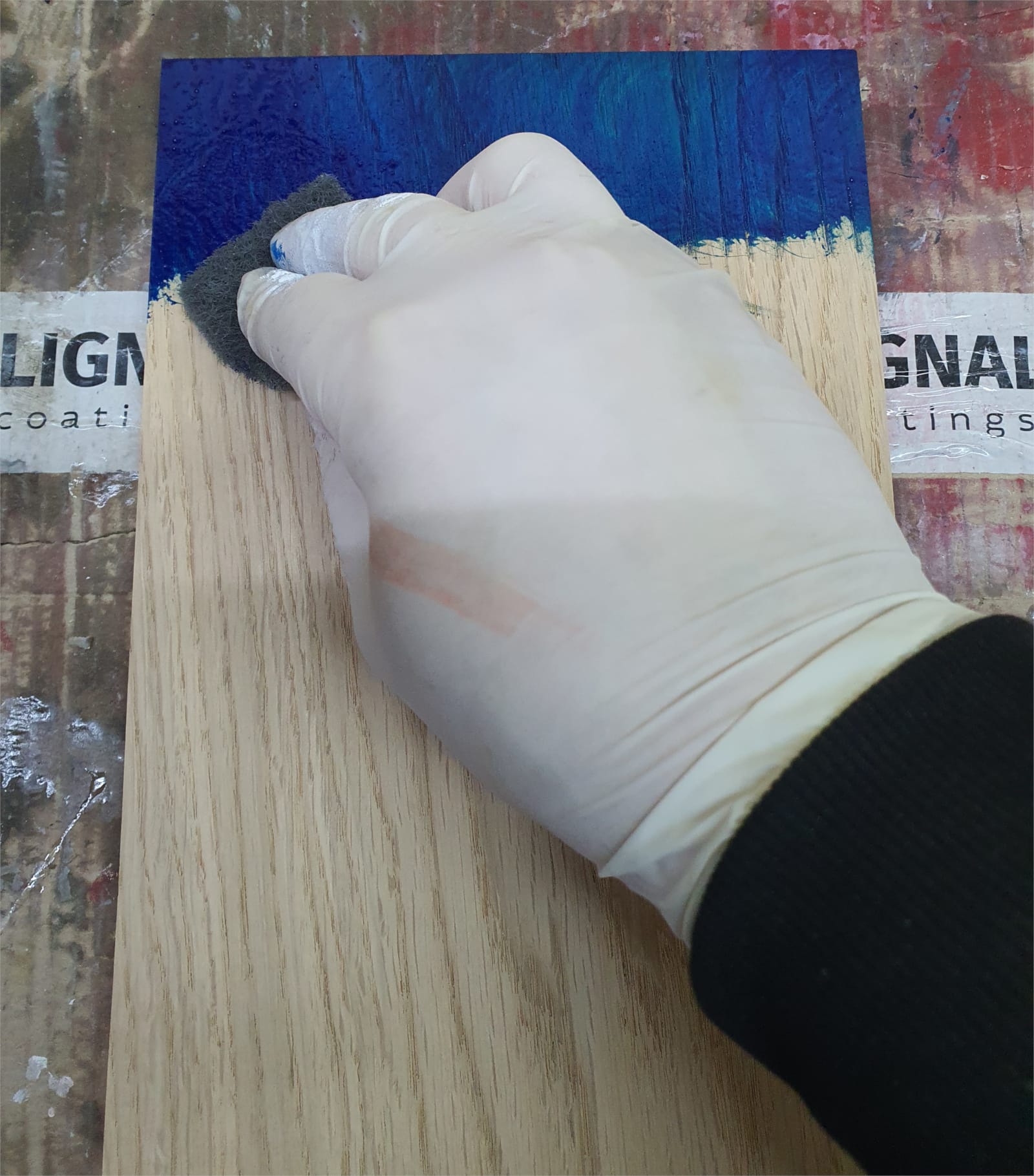 Gotowa próbka po nałożeniu pierwszej warstwy oleju. Teraz mogę odczekać około godziny i nałożyć w identyczny sposób drugą warstwę. Gdybym jednak odczekał ponad 16 godzin, musiałbym wykonać międzyszlif (P320–P400) i odpylić powierzchnię. Dopiero wtedy nakładałbym drugą warstwę.