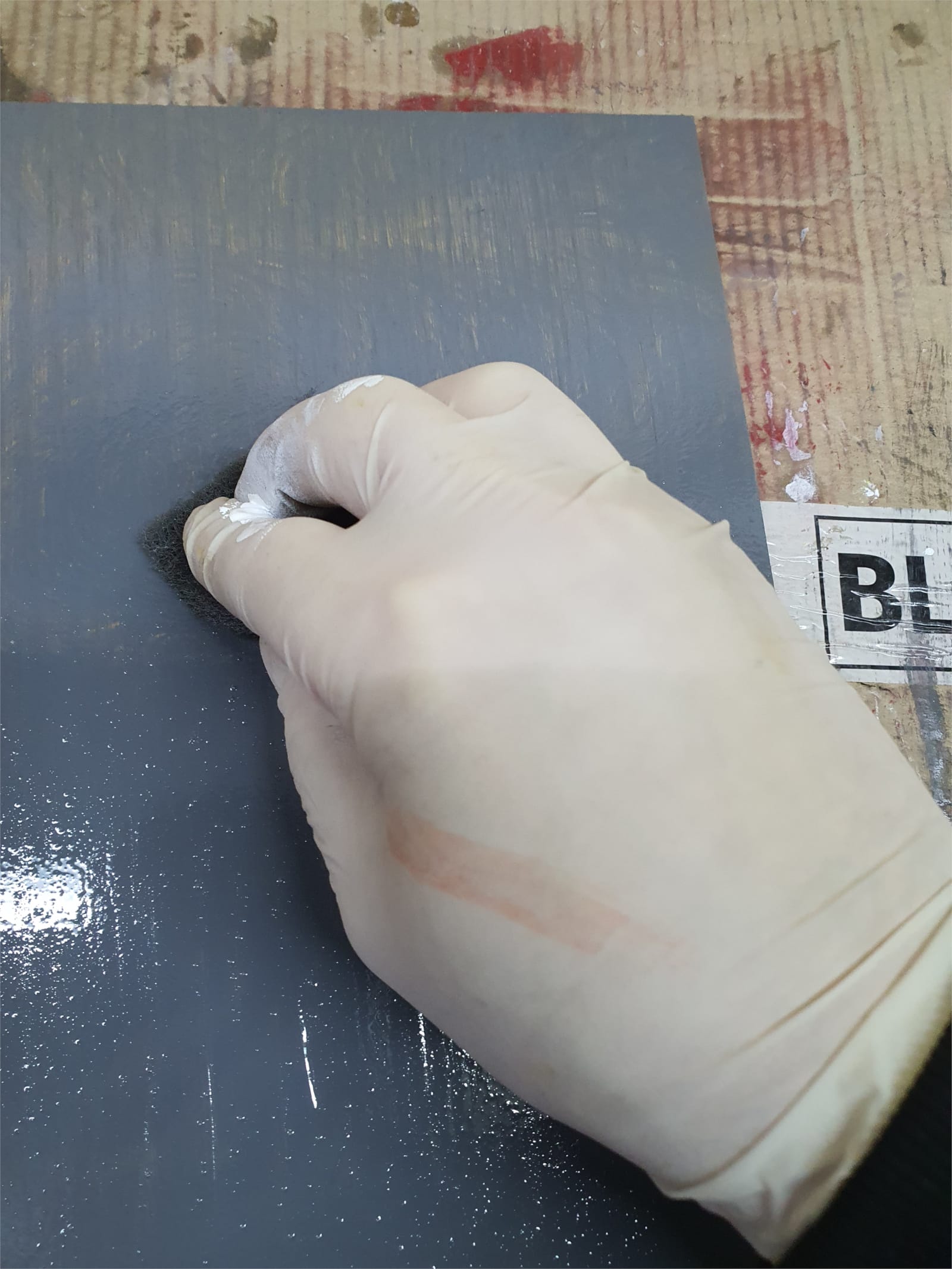 - Międzyszlif (Klucz do gładkości): Po 16h wykonujesz delikatny szlif papierem P320–P400. Ja stosuję P320 – robię to szybko i lekko. Cel jest jeden: usunięcie ostatnich mikrowłókien i aktywacja powłoki pod kolejną warstwę.
