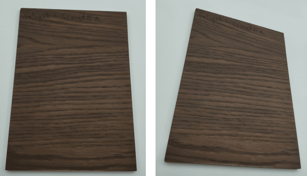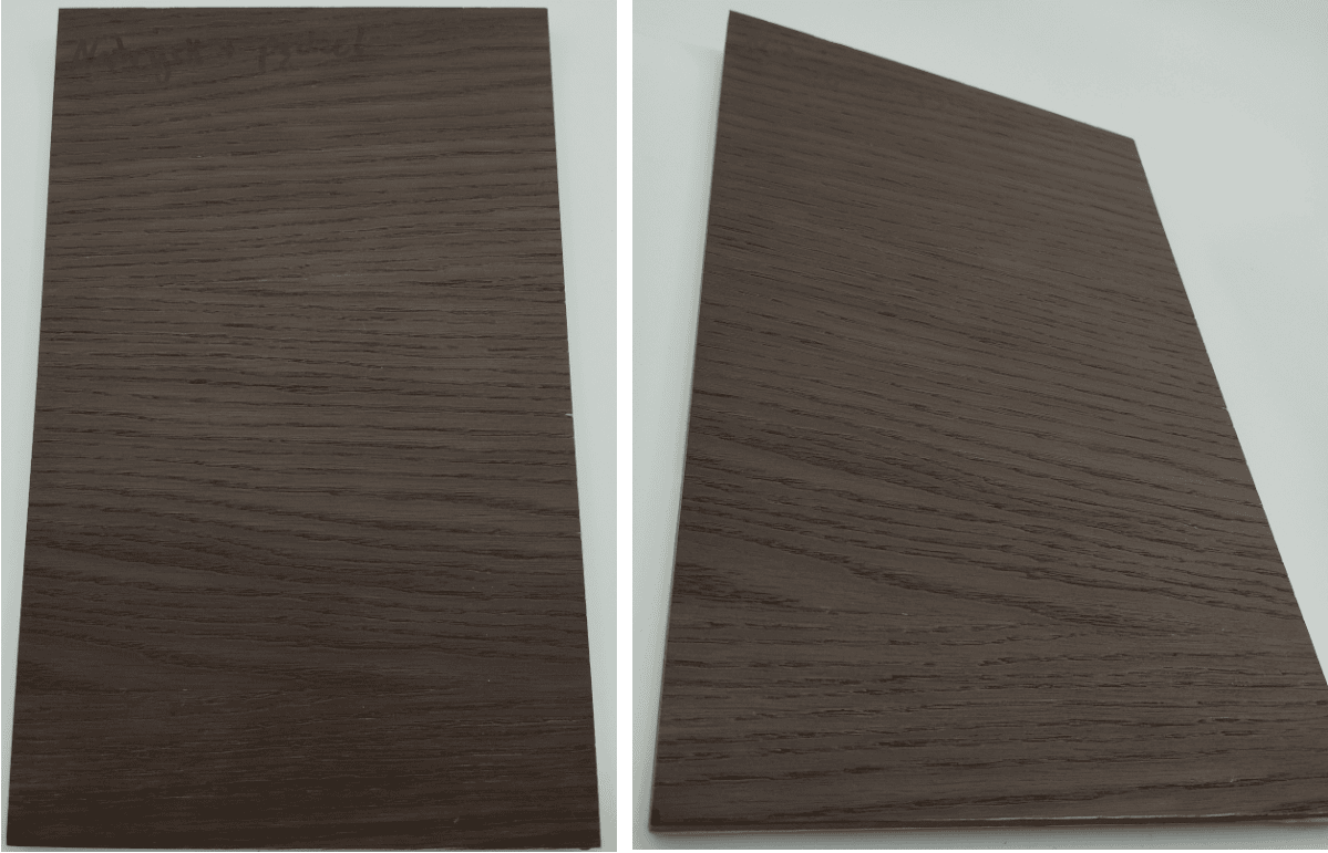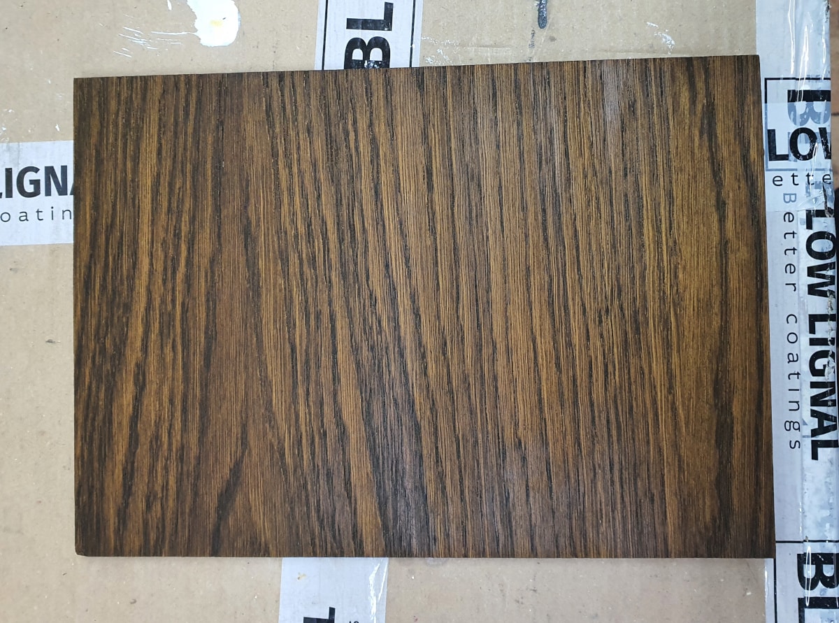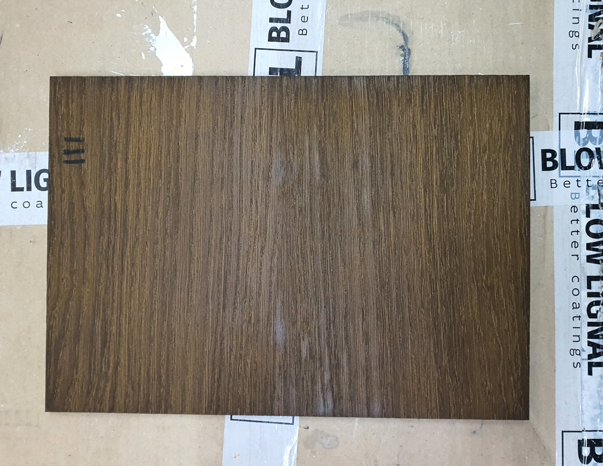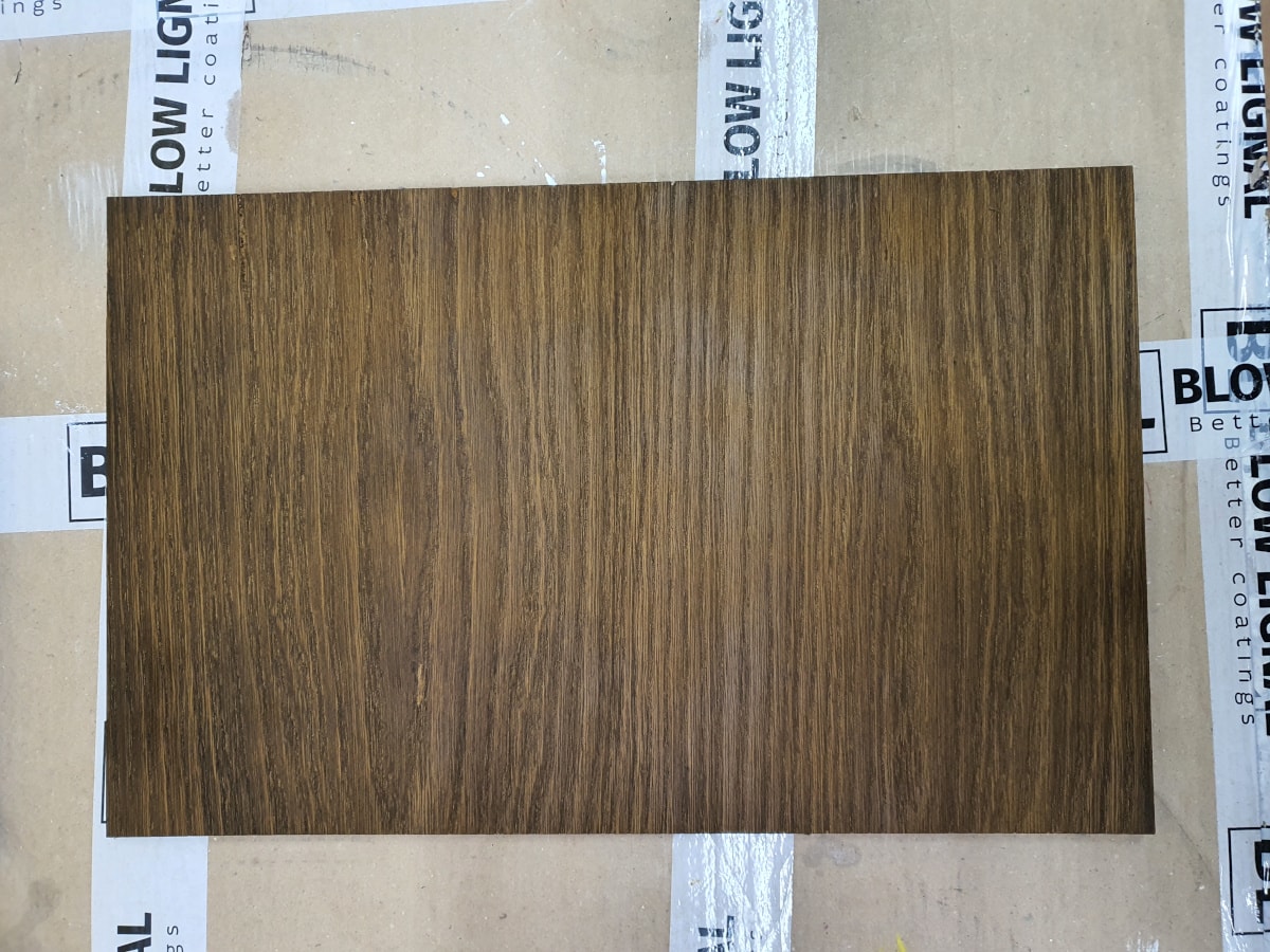 Komentarz do zdjęcia: Element tutaj wygląda inaczej, ponieważ jest wyjęty z kabiny natryskowej. Na stole prezentacyjnym jest inne światło. Tak wygląda pobejcowana formatka po drugim przejściu.
