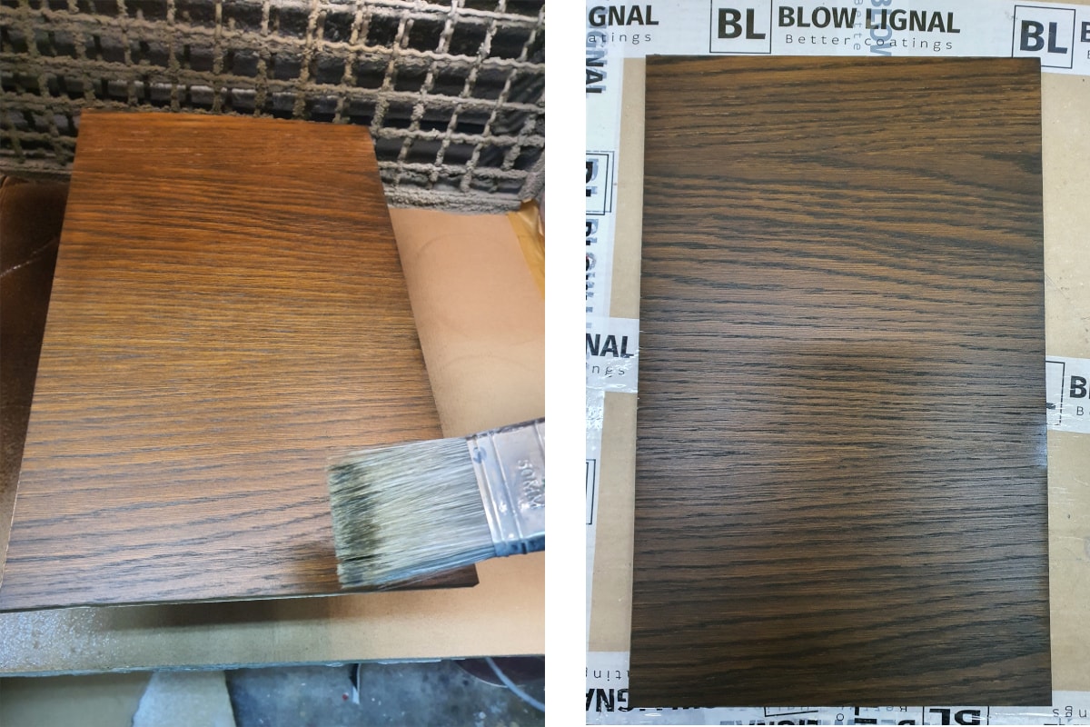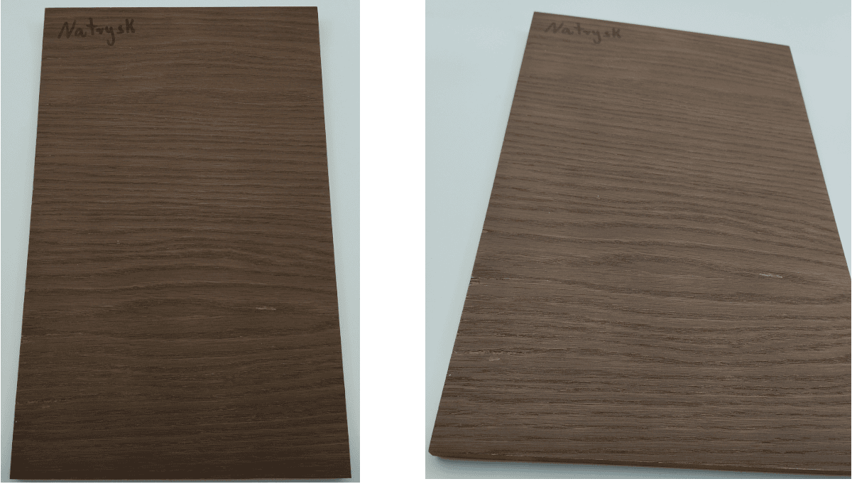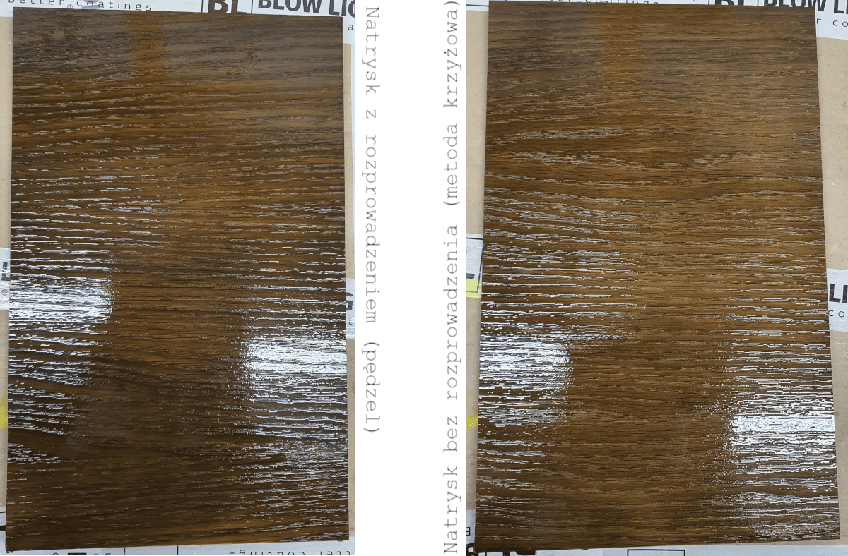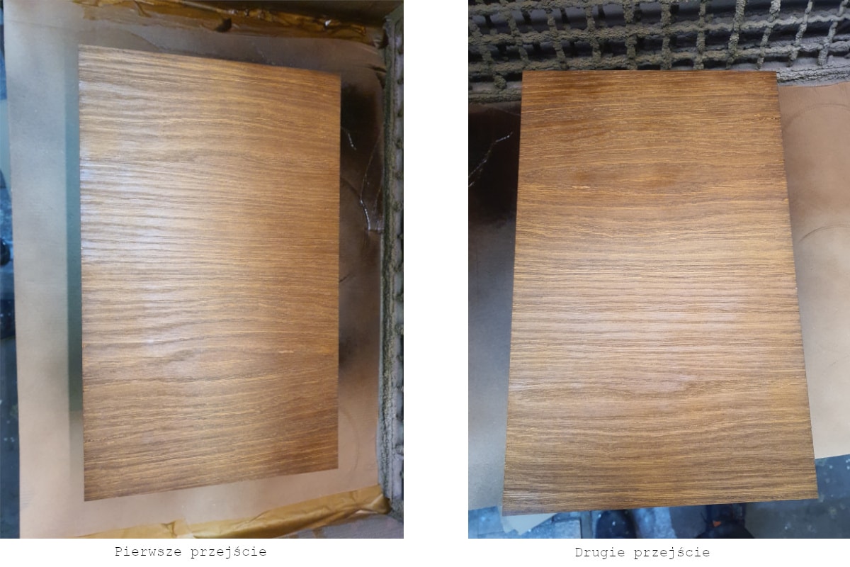 - Lewa strona: Formatka po pierwszym przejściu pistoletem. Kolor jest jeszcze delikatny i nie w pełni nasycony.