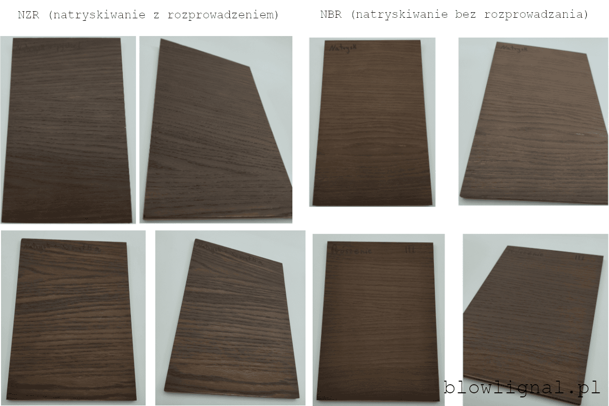 - Aplikacja „na sucho”: Pistolet prowadzimy sprawnymi ruchami. Dzięki małej dawce i większej odległości, mikro-kropelki osiadają na strukturze i wysychają niemal natychmiast po kontakcie z dębem.